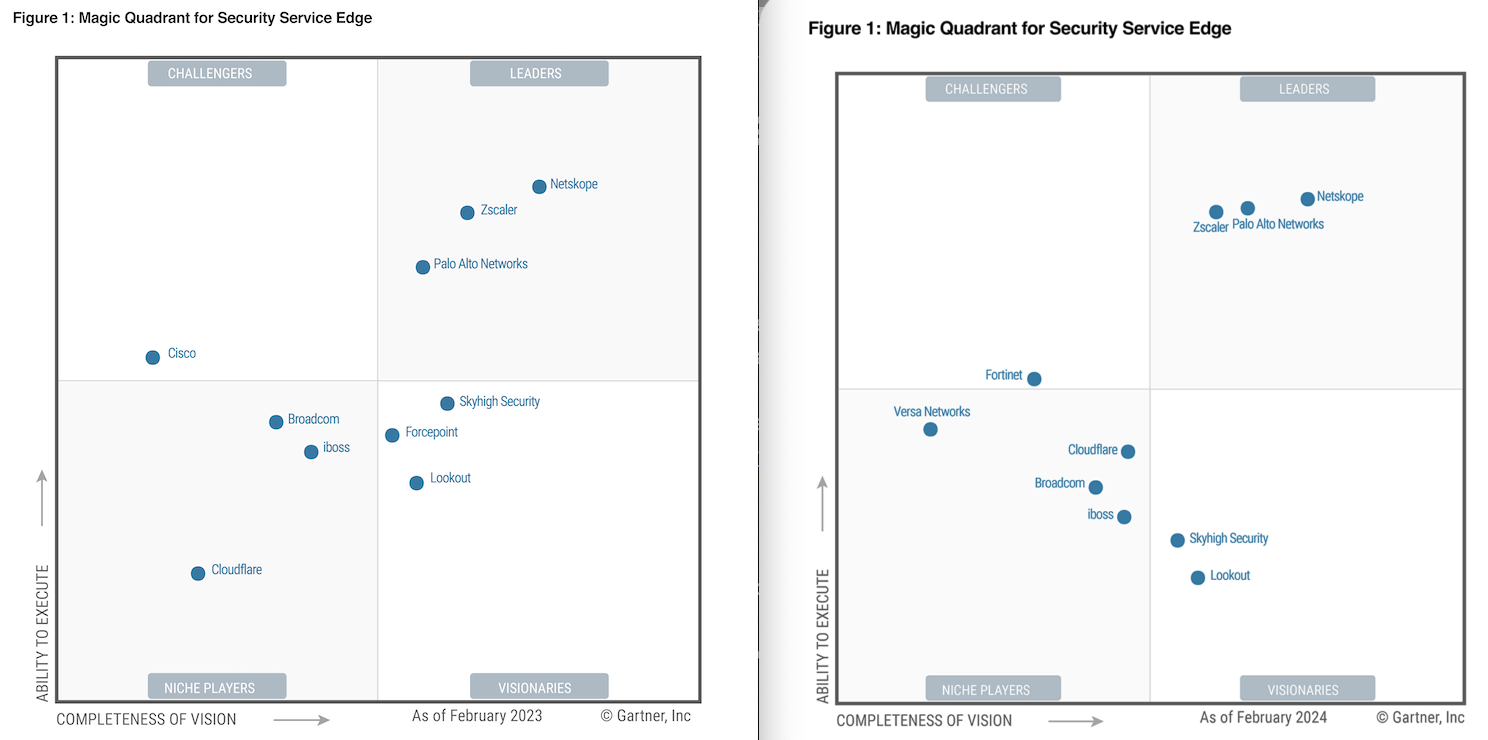 Netskope moved into SASE after its acquisition of Infiot in Aug-22. Zscaler and Cloudflare are newer entrants in these SASE reports, as they lacked the SD-WAN branch interconnectivity that Gartner saw as a requirement. Zscaler and Cloudflare both eventually added Branch Connector and Magic WAN Connector [premium link] in 2023 and now appear on these reports.