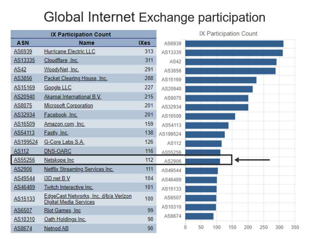 That 3rd-party report noted that Netskope is the 12th most active Internet interconnection (IX) participant, up there with the hyperscalers (Amazon, Meta, Google, Microsoft). Note Cloudflare in 2nd place (as well as Akamai and Fastly), which is from their long history in core app services (CDN, DDoS, WAF) served by their edge network – a huge strength that enabled them to enter the SASE market with an interconnection advantage.